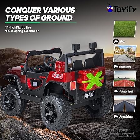 [Dual Mode Electric Kids Driving Thar Jeep] The Battery operated car can be controlled by dual control modes. Parents can help their children manage this jeep with a 2.4G wireless remote controller or baby can operate this car by himself/herself by stepping on the accelerator, turning the steering wheel, and shifting the forward/backward moving mode, your kids will practice hand-eye-foot coordination, enhance courage, and build confidence through this beautiful vehicle.