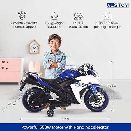 Product Details: This 550W single-motor bike supports up to 35 kg and ensures safety with hand-throttle acceleration, LED headlights, wheel lights, balance wheels, and a reliable brake system. Features include a push-button start, digital display, forward/reverse modes, and a max speed of 5 km/h. It also offers a music panel with USB, volume control, and a horn. Battery-operated, it?s designed for stability and fun, making it ideal for young riders.